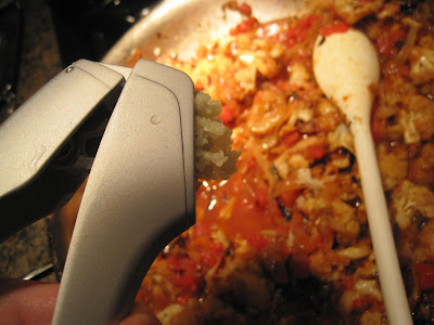 Now I like to add a couple cloves of minced garlic. The sliced roasted garlic has a sweet and mellow taste. I want some fresh sharp garlic in my pasta sauce too.