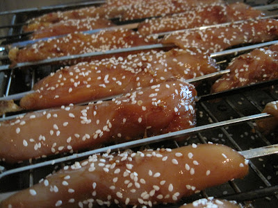 Mix marinade ingredients and pour over chicken. Marinade at least 1 hour. Two or three hours is ideal. Skewer chicken and sprinkle with sesame seeds. Grill or broil 8-10 minutes, turning once while cooking.